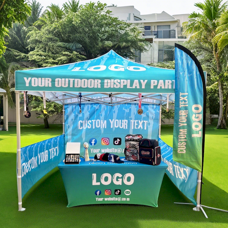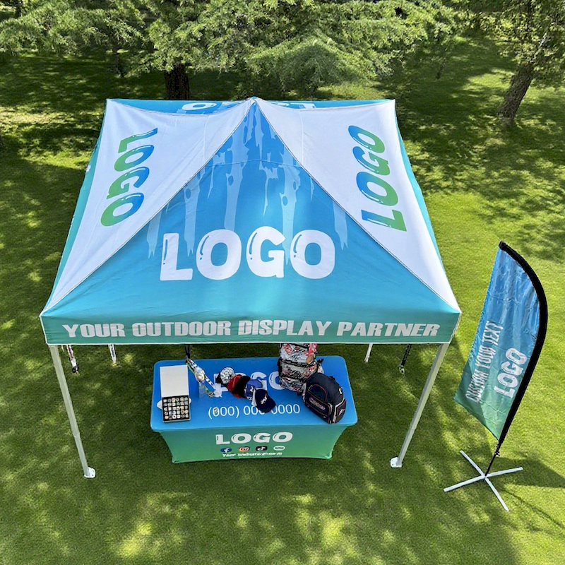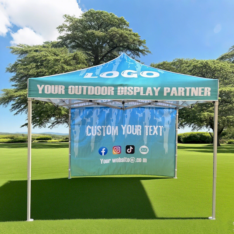 Outdoor promotional booth tents, semi-automatic quick setup, pop-up tents, customizable hoarding with logo.